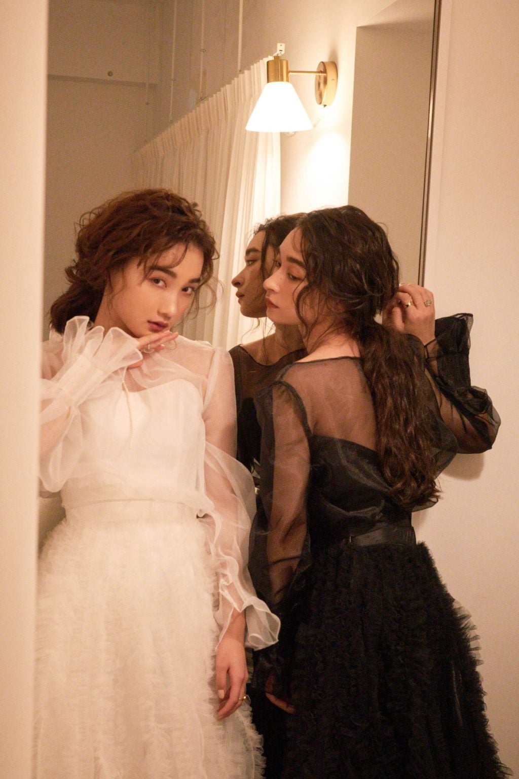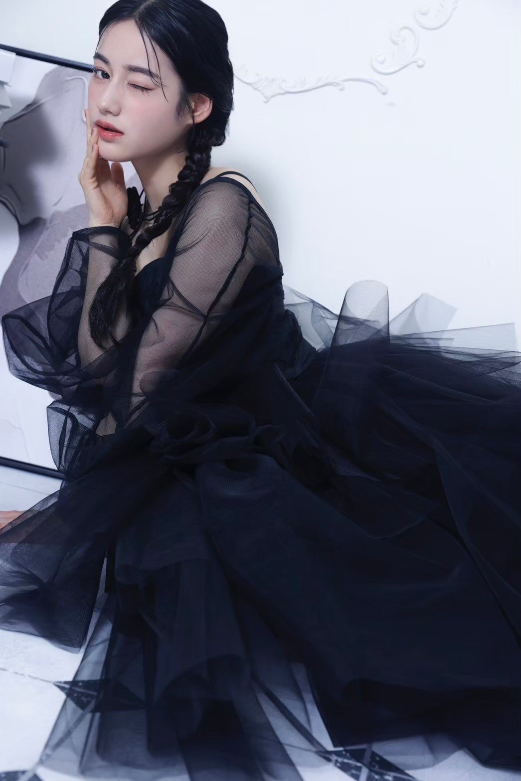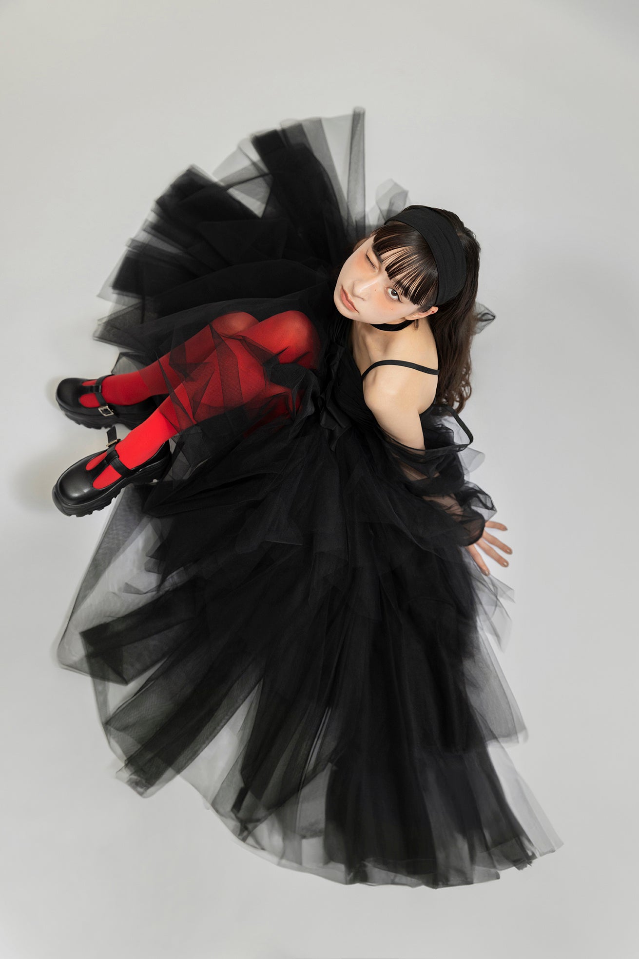 オリジナルデザインのチュールドレス。ブラックとホワイトの2色展開で、細部のデザインが少し異なるこだわりのドレスとなっております。上半身は透け感のあるオーガンジー素材で出来ており、スカートはフリルを何重にも重ねることでガーリーなシルエットに。