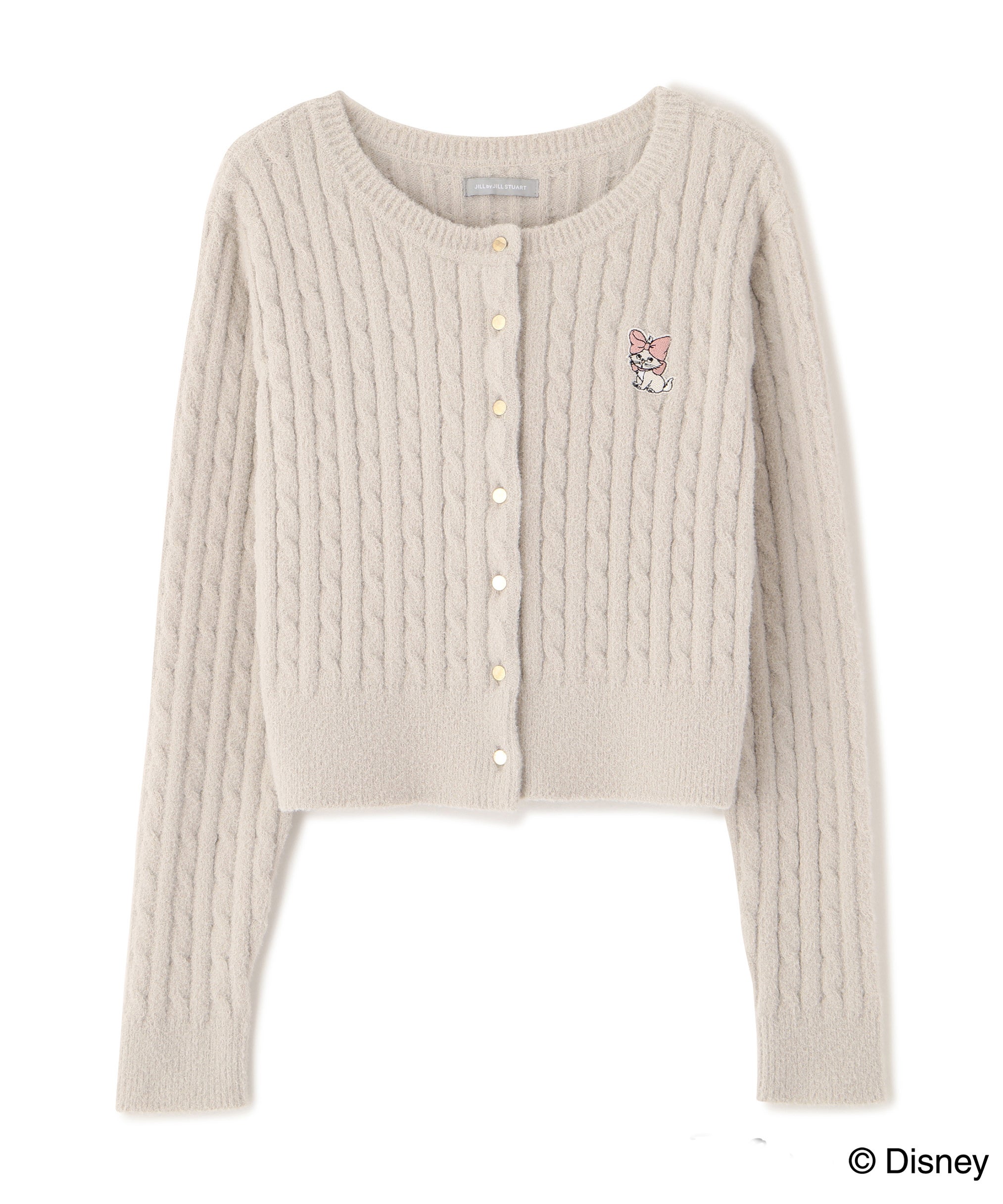 ショートシャギー糸を使用し、ふわふわのケーブル編みで仕上げたカーディガンです。胸元にはマリーの刺繍入り。