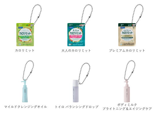 本製品は、ファンケルの人気製品を全高約51mmから60mm(ボールチェーンおよびヒートン含まず)のサイズで再現したミニチュアチャームです。ラインアップはサプリメントの人気製品「カロリミット」シリーズの「カロリミット」「大人のカロリミット」「プレミアムカロリミット」のほか、化粧品で大人気の「マイルドクレンジング オイル」、スキンケア製品の「トイロ バランシングドロップ」、ボディケア製品の「ボディミルク ブライトニング&エイジングケア」の全6種です。