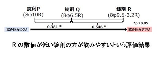 一般的な錠剤は上下がなだらかな曲面になっています。今回、この曲面の丸みの度合い(=曲率半径、以下Rと表記)を変えることで、飲みやすさがどう変わるかを評価しました。同じ重さの錠剤でも、Rを小さくすると見た目はより丸く、球体に近くなり、厚みはやや増えます。それでも、Rが小さい、いわゆるより丸みが強い錠剤の方が、総合的に「飲みやすい」という結果が得られました(下図)。