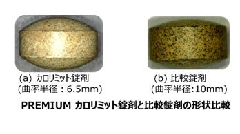 これらの知見は、当社の「プレミアムカロリミット」の開発に生かしてRの小さい錠剤形状を採用し、コーティング量も1.0%以上にすることで、飲みやすさを向上させています(下写真)。