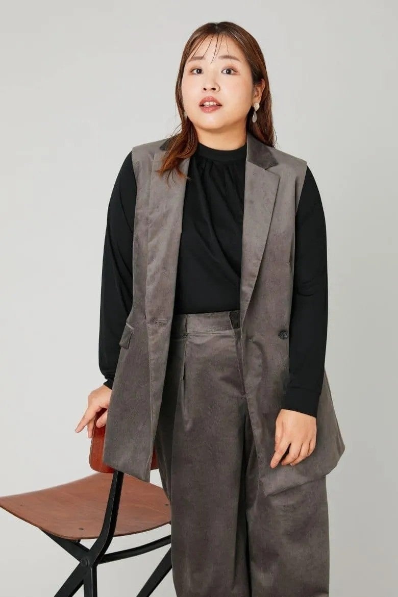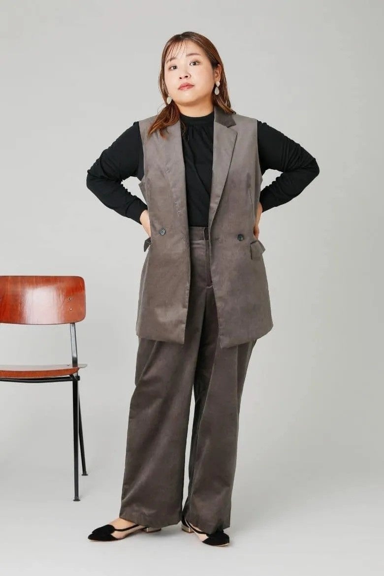 ジレ×ワイドパンツのセットアップでトレンドライクな着こなしに。リラクシーでありながら、生地の光沢がカジュアル感を抑え、上品に見せてくれます。インナーはブラックを合わせ、ライトコール生地の持つ温かな表情を引き締めました。