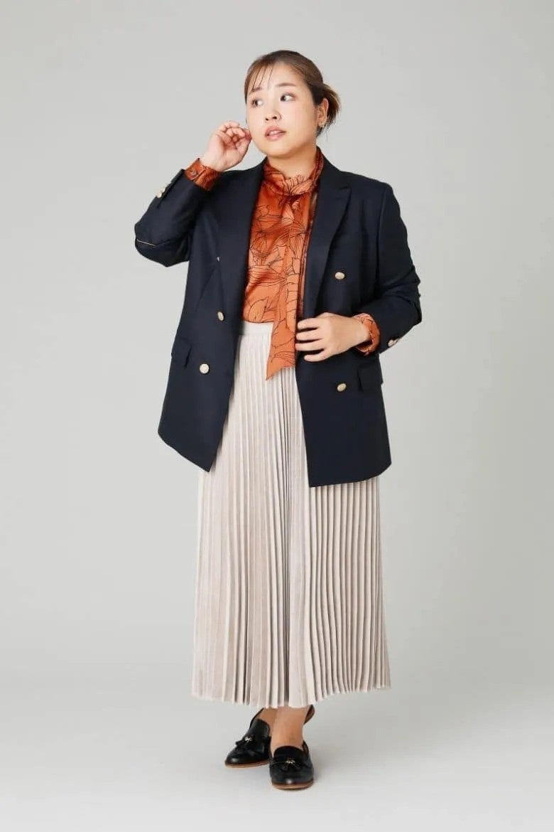 クラシカルなWブレストのネイビーブレザーに、光沢のあるプリントブラウスをインして艶感をプラス。明るいブラウンが秋のムードを高めます。プリーツスカートが縦のラインを強調し、ジャケットのボクシーなシルエットをすっきりとした印象に。