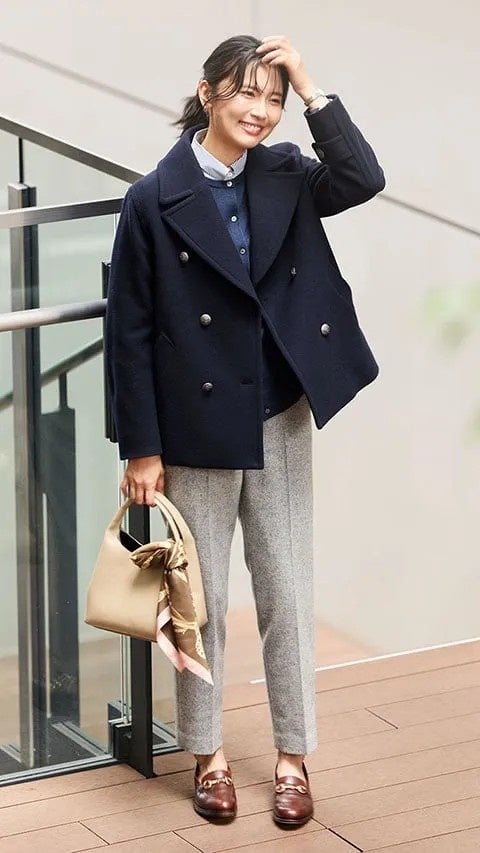 忙しい朝も迷わず手に取りたくなる、信頼の上質ベーシックコーデ。ピーコートはラムウール100%の素材の良さと、美しいシルエットで大人の品格を感じさせて。ジャケット未満のきちんと感を叶えてくれるネイビーのカーディガンは、1枚持っていれば大抵のスタイリングを解決してくれる冬の最適解アイテムです。