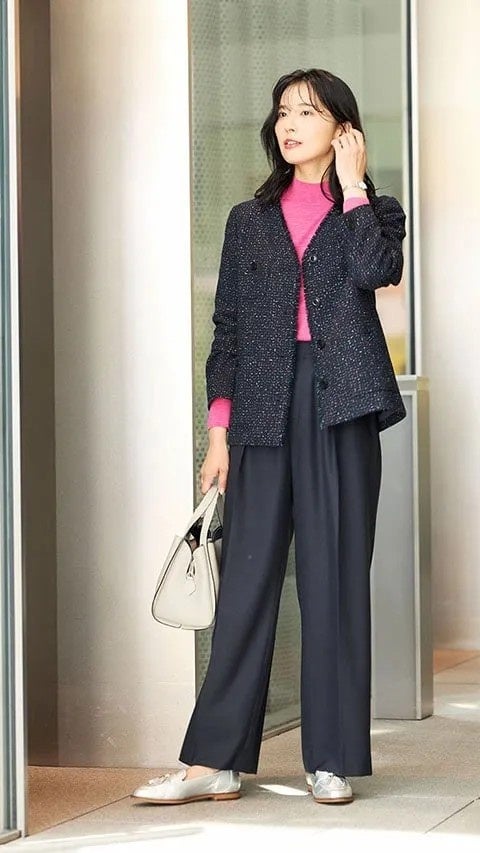 大人の“さじ加減”が光るツィードジャケットは、ネオンカラーの糸を織り交ぜることでさりげなく華やぎを演出。かっちりしすぎず軽やかに羽織れるので、コート前のアウター代わりにもおすすめのアイテムです。ピンクのニットを差し色に、ネイビーのワイドパンツで品よくまとめれば、オフィスでも浮かずに、自分らしいお洒落を楽しめるバランスに。