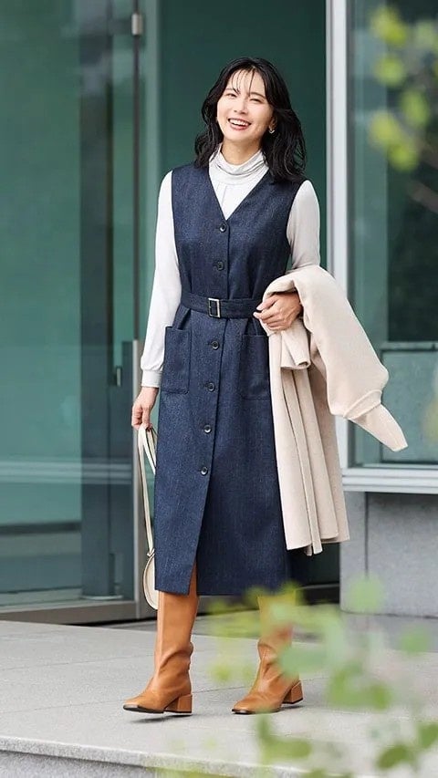 いつものジャンスカに飽きたら、デニム調ジャンスカで着こなしを更新。清潔感のあるデニム風の素材感×ストライプとベルトのアクセントが、全体をすっきり引き締めます。コートを羽織っても重くならず、仕事後の予定にもそのまま出かけられるフレキシブルさが魅力。“手抜きじゃないのに、ちゃんとおしゃれ”を叶える、大人のオフィスカジュアルです。