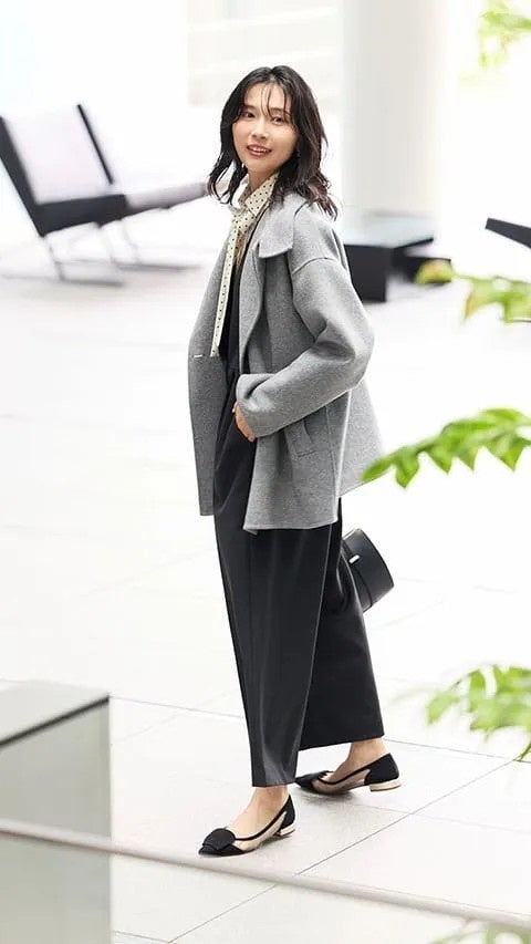社内行事や退勤後の予定にもそのまま出かけられる、頼れるきれいめカジュアル。黒のオールインワンを取り入れて、きちんと見えてほどよく華やぐ、オフィスカジュアルの理想形にアップデート。さらに、ボウタイブラウスを重ねて、年末年始にもぴったりのクラシックなムードをひとさじ。グレーのコートをプラスすれば、堅すぎず上品なバランスが完成します。