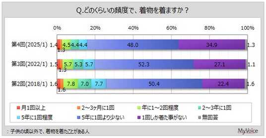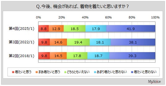 マイボイスコム株式会社(東京都千代田区、代表取締役社長:高井和久)は、4回目となる『着物』に関するインターネット調査を2025年1月1日~7日に実施しました。