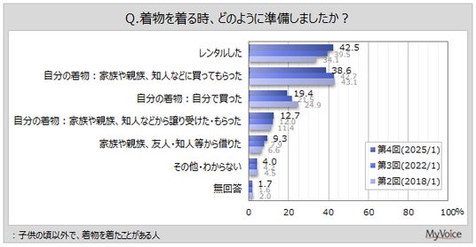 ■着物の着用経験者のうち、1回しか着た事がない人は約35%。準備方法は「レンタル」が4割強で微増傾向