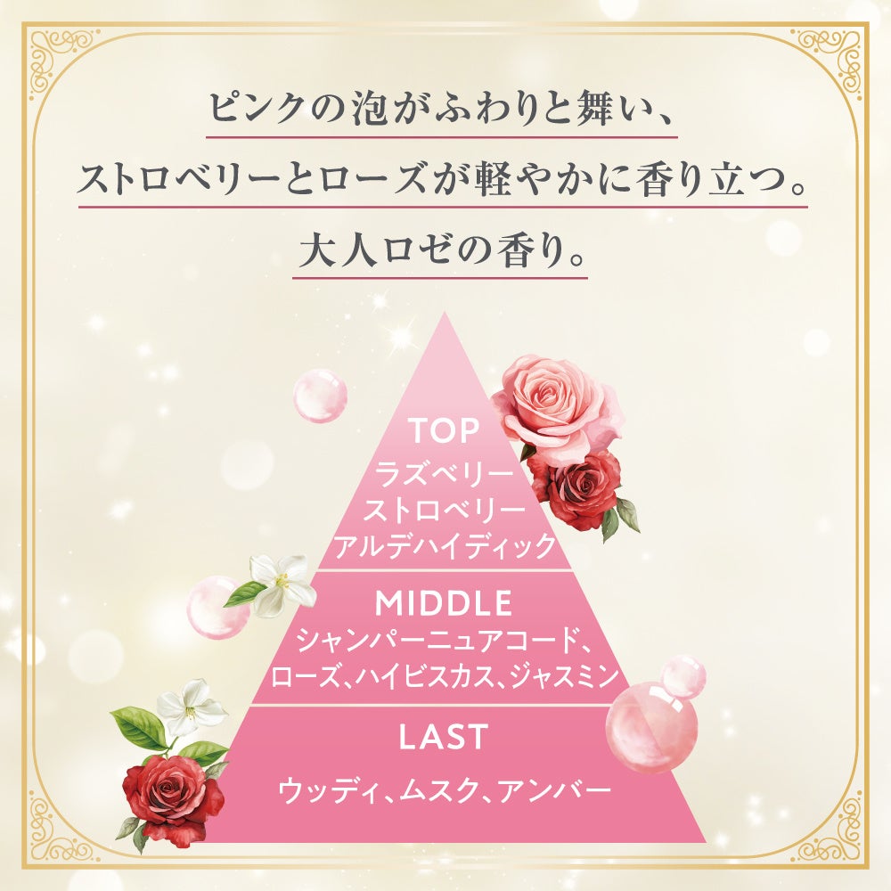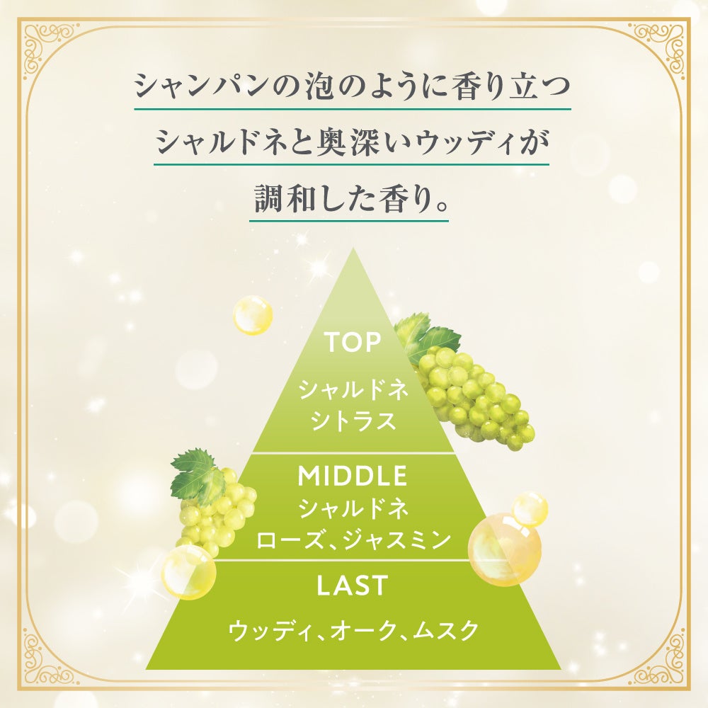 香りは、シャンパンの泡のように香り立つシャルドネと、奥深いウッディが調和した〈シャルドネブリュットの香り〉。そして、ピンクの泡がふわりと舞い、ストロベリーとローズが軽やかに香り立つ〈ロゼシャンパンの香り〉の2種類。華やかで上品なパッケージとともに、きらめくホリデーシーズンにふさわしい香りの贈り物として楽しめます。
