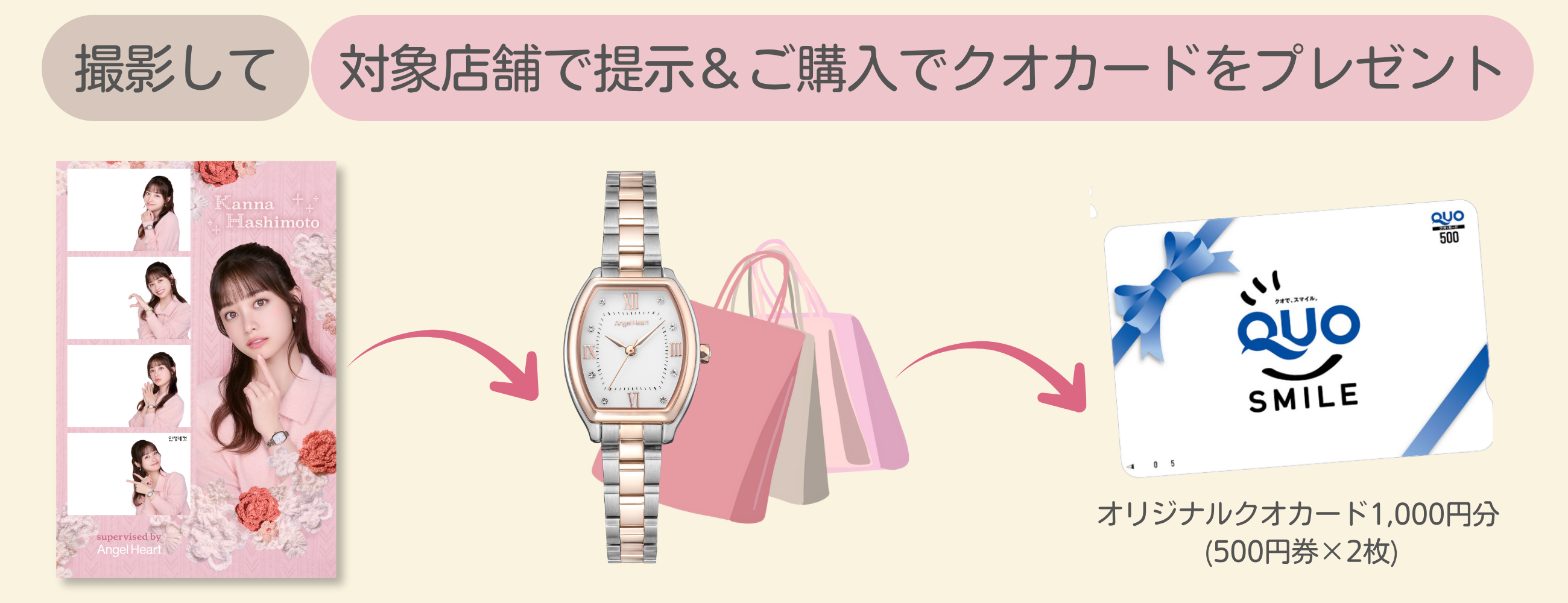 「橋本環奈×Angel Heart」コラボレーションフレームで撮影したシートを対象店舗へお持ちいただき、エンジェルハートの腕時計をご購入いただくと、**オリジナルQUOカード(1,000円分)**をプレゼントいたします。