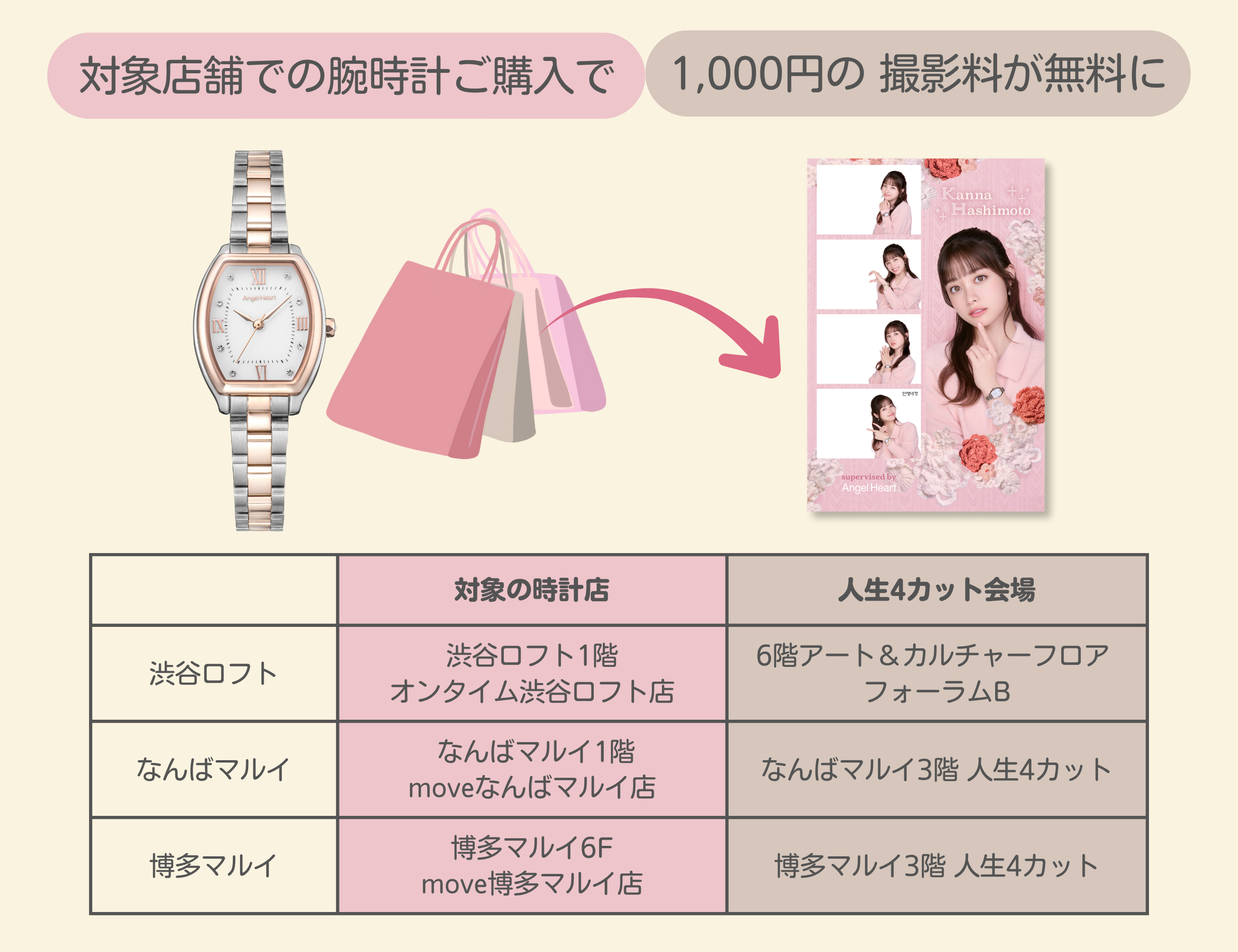 オンタイム渋谷ロフト店/moveなんばマルイ店/move博多マルイ店にてエンジェルハートの腕時計をご購入いただくと、同館内で展開中の「橋本環奈×Angel Heart」コラボフレーム(通常1,000円)を無料でお楽しみいただけます。