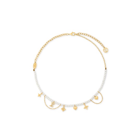 斬新で洗練された組み合わせがメゾンのアイコニックなエンブレムを強調する「ネックレス・ブルーミング パール」。艶やかなガラスパールのネックレスを、LV イニシャルやモノグラム・フラワー、ゴールドトーンのメタルで象った2つのプレシャスなハートなどの魅力的なチャームで飾りました。