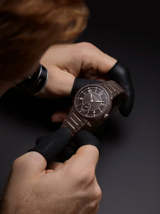 モノクロームの外観を完成させるのが、ブラウンのステップダイアルです。その洗練された構造は、完璧なバランス感覚と共鳴し、繊細でありながら主張のあるエレガンスを表現しています。独特の光沢感は、ガルバニック処理を施した後にラッカーを何層にも塗り重ねることで実現し、ブラウンのセラミック製ケースとブレスレットにマッチする完璧な色合いを生み出しています。また、さまざまな仕上げが、魅力的な深みをさらに引き立てます。文字盤の中央部は縦方向のサテン仕上げ、アワーディスクはサンドブラスト加工、スモールセコンドカウンターはスネイル仕上げが施されています。針、マーカー、数字は18Kローズゴールド製。手作業で塗布されたスーパールミノバ(R)がブルーの光を放ち、あらゆる状況で最適な視認性を確保します。
