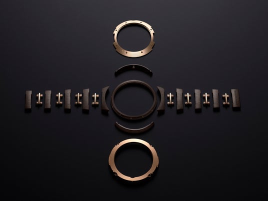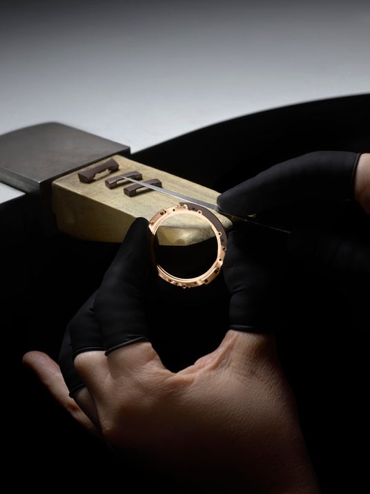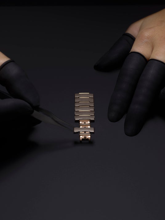 この初となるセラミック製「タンブール」の開発においてもう1つの挑戦となったのが、ブレスレットでした。流れるようなラインと卓越した人間工学デザインを維持しつつ、ケースとのシームレスな一体感を実現するために、ブレスレットは全面的に再設計されました。ケースからフォールディングバックルに向かって徐々に細くなっていくブレスットは、手首に完璧にフィットし、耐久性を高めるために、リンク1つ1つがカーブを描く丸みを帯びた輪郭に仕上げられています。手作業で丁寧にサテン仕上げが施された表面は、手作業で磨かれた面取りやポリッシュ仕上げのローズゴールド製センターリンクとコントラストを成しています。ブレスレットの製造時間の80%は、手作業による仕上げに費やされます。