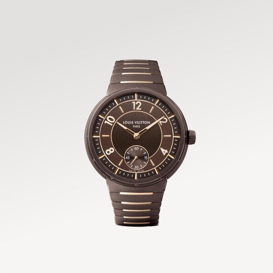 ルイ・ヴィトンは、「タンブール」をセラミックで再構築するため、メゾンのトランクを象徴する色合いから着想を得た独自のセラミックカラーを開発。ブラウンは、2002年以来「タンブール」の文字盤のエンブレマティックなカラーであり、そのエッジの効いたスタイルとカジュアルエレガンスをより高めています。最後に、ローズゴールドとセラミックの組み合わせが、ラグジュアリーな雰囲気と重厚感を添えると同時に、このモデルの丈夫さにも貢献しています。