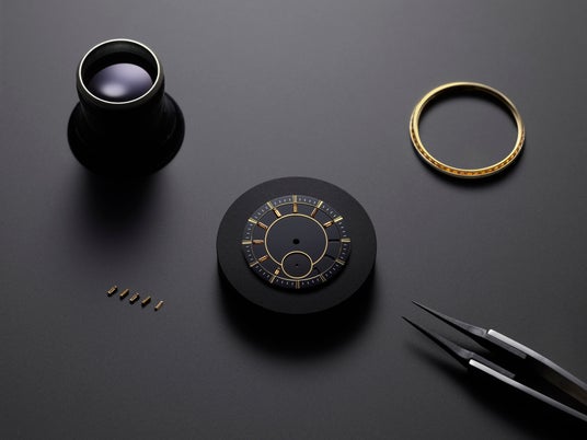 この華やかな新作は、ルイ・ヴィトンが「タンブール」コレクションで初めてハードストーンを使用したモデル。ブラックアゲートの1種であるブラジル産オニキスからなるパーツを複数組み合わせて作られたダイアルがシームレスな反射面を描き、その上にセットされたサフランカラーのバゲットカットサファイアのインデックスが、ケースの暖かみのあるゴールドの色合いと見事に調和。これほどエレガントなデザインを実現するのは、並大抵のことではありません。オニキスの原石を熟練した職人が機械で削り出し、薄い層を形成する工程は寸分の狂いも許されず、例えわずかであっても誤差が生じた場合は、手順を最初からやり直さなければなりません。これらの薄い層はダイアルの各パーツに成形され、それぞれのストーンの特性を考慮し、必要に応じて調整されます。