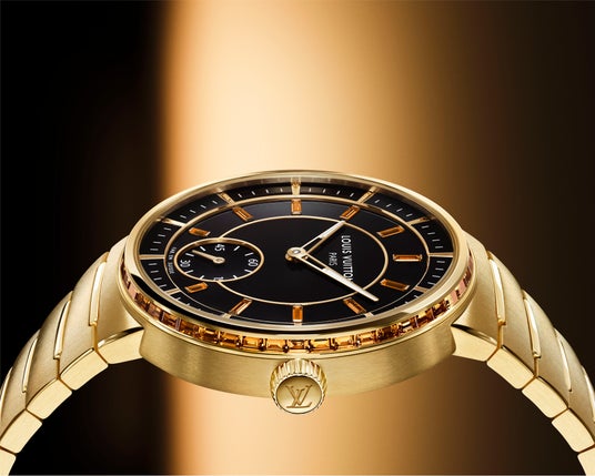 バゲットカットサファイアのインデックスに鮮やかなサフランカラーが選ばれたのは偶然ではありません。ルイ・ヴィトンが1911年に発表したヴィトニット・キャンバスのトランクから着想を得たこの暖かみのある色合いを、ウォッチのベゼルにセッティングされた48個、合計約2.22カラットにもおよぶバゲットカットストーンに採用。ケースのゴールドカラーを際立たせながら繊細な輝きを放つストーンは、ダイアルの深みのあるブラックと相まって、目を引くまばゆい美しさを生み出しています。