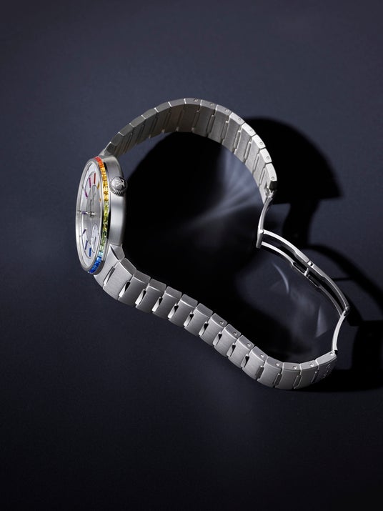 虹色に輝くベゼルを引き立てるのは、6時の位置にある渦巻き模様の入ったスモールセコンドカウンターを配したシルバーオパーリンのダイアル、スーパールミノバ(R)を手作業で塗布した18Kホワイトゴールド製の針、そして18Kホワイトゴールド製のインデックス。ベゼルの壮麗な虹色に美しく調和するインデックスには、11色のカラーグラデーションを描くサファイアとルビーをセット。丈夫なサファイアクリスタルで保護されたダイアルから放たれる多色の魅惑的な美しさが際立つ本モデルは、サテンおよびポリッシュ仕上げを施したプラチナ製の一体型ブレスレットと、18Kホワイトゴールド製の目立ない3つ折りのフォールディングバックルで仕上げられています。