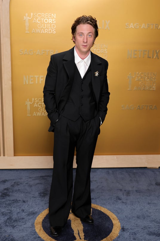 ジェレミー・アレン・ホワイトは、カスタムメイドのブラックのスリーピースシングルブレストのタキシードにブラックのチェルシーブーツを合わせました。