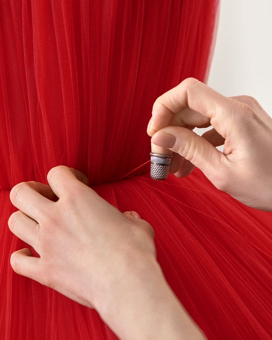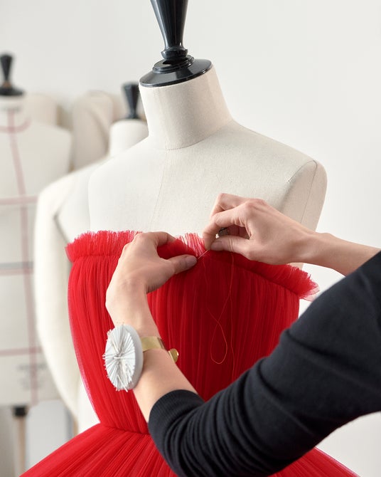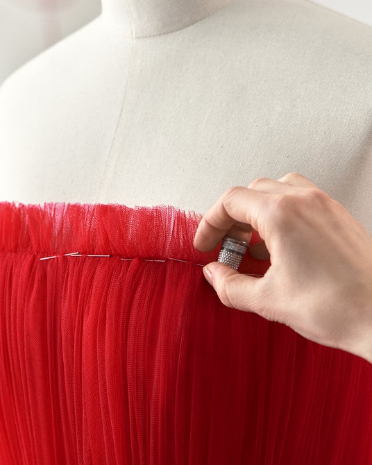 ダニエル・デッドワイラーが着用したチュールビスチェドレスは、すべて手作業によるプリーツ加工で円錐形断面の重ね合わせで作られています。それぞれの縫い目には、縁取りのレリーフが接合部を強調し、目に見えない超軽量の内部構造により、外側にプリーツチュールを重ねた建築的なフォルムがデザインされています。