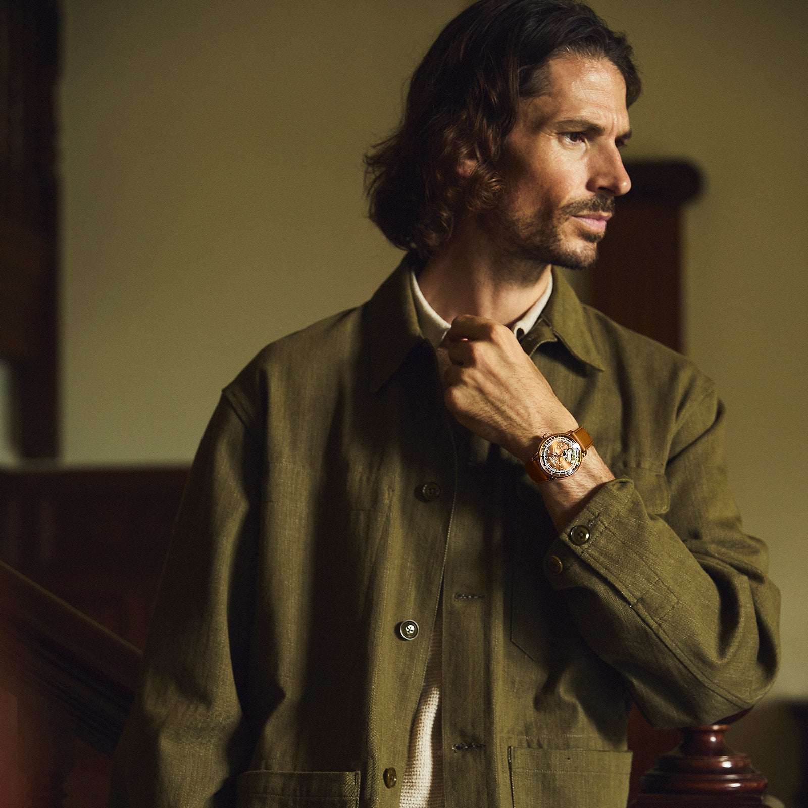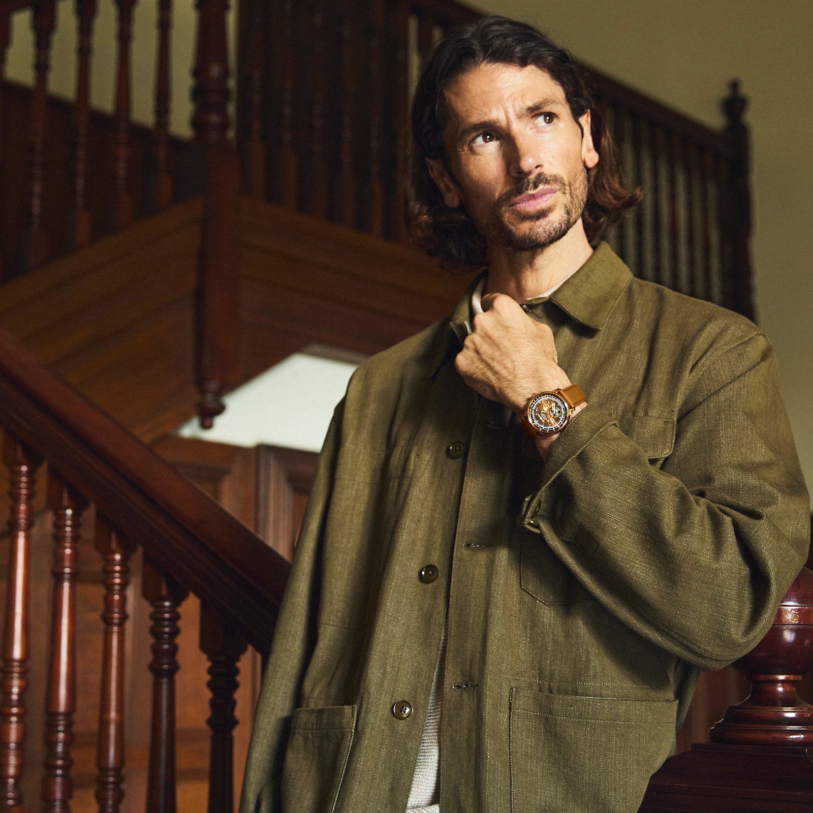 ブラウン系を基調としたタンカラーと赤煉瓦を彷彿とさせるダイヤルは、秋冬ファッションとの相性も抜群。カジュアルなシャツジャケットから、風合い豊かなジャケパンスタイル、さらにはウールのコートにも自然に馴染み、大人の装いにさりげない色気を添えます。
