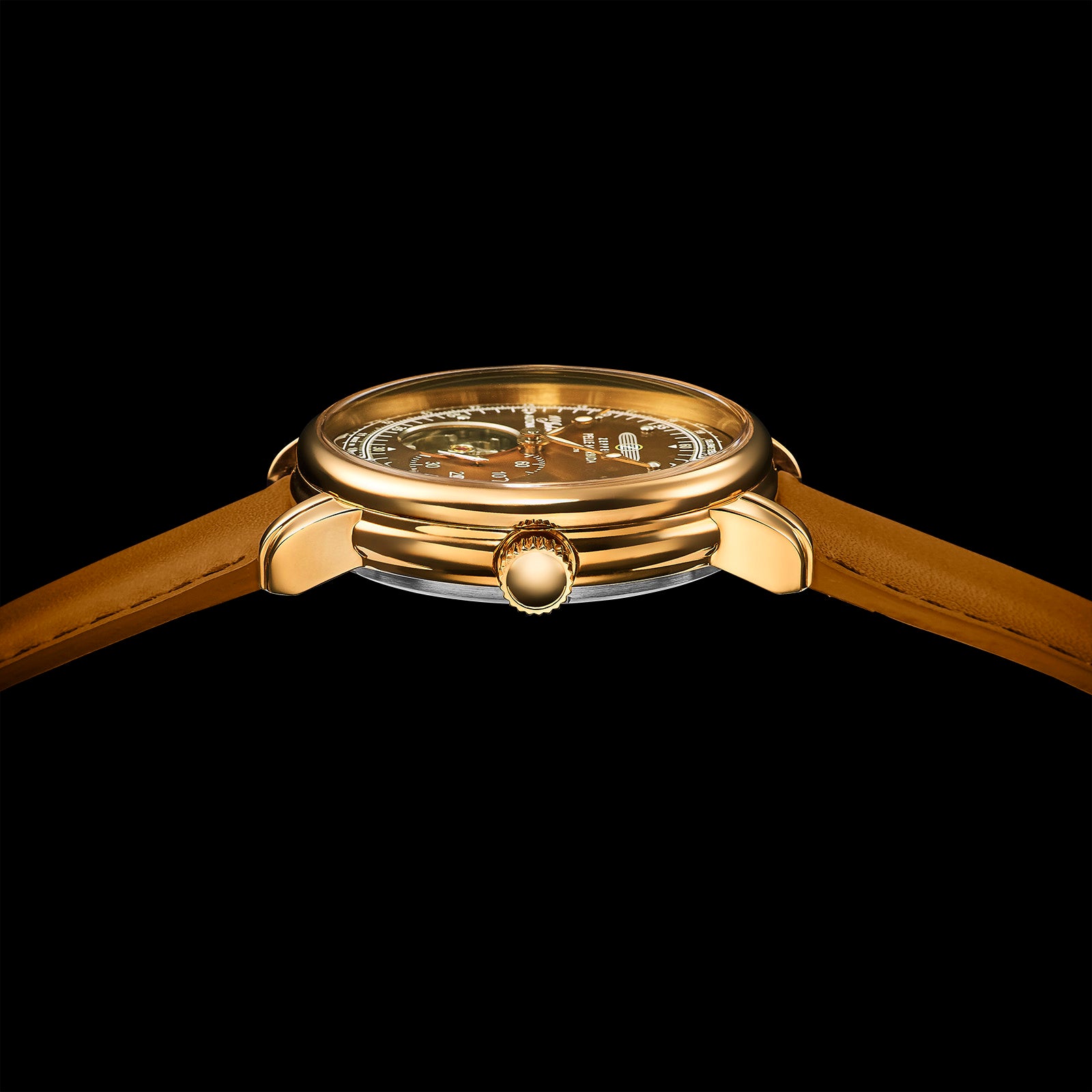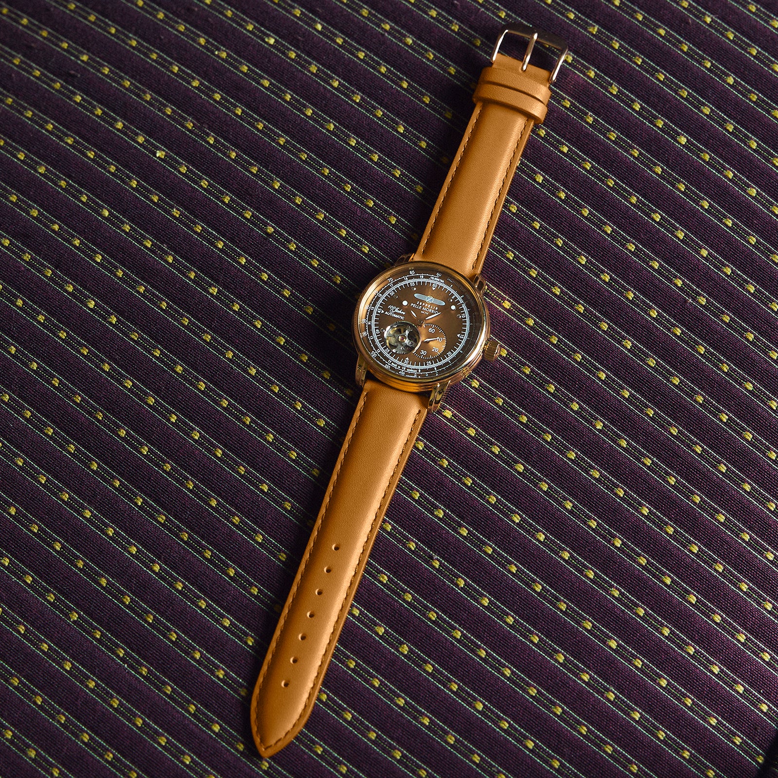 さらに、フィレンツェの赤煉瓦をイメージした特別カラーを採用し、ZEPPELINとして初のメタリックな仕上げをケースに施しています。飛行製をモチーフにした丸みを帯びたフォルムと色味、そして美しいタンレザーが融合することで、クラシックとモダンが見事に同居することとなりました。