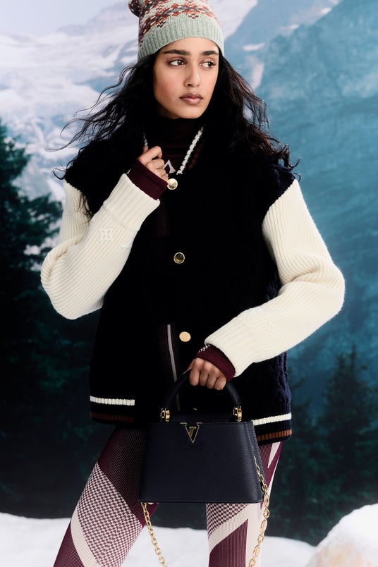 より冬らしいルックを演出するため、「カプシーヌ」や「ネヴァーフル・インサイドアウト BB」にはシアリング素材があしらわれ、チョコレートやベージュの「コージーグラム」バージョンで再解釈されています。モノグラム・キャンバスとメリノシアリング素材を組み合わせ、マフとバッグを融合させたクリエーション「テディ・ミット」は、魅力的なコレクターズモデルです。