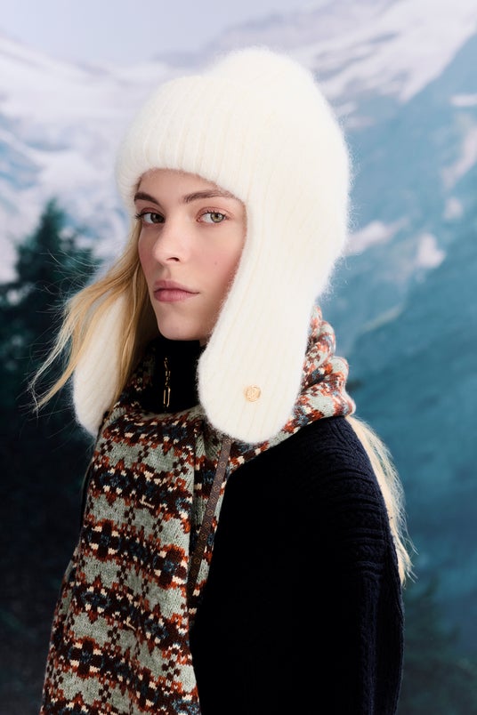 冬の寒さに立ち向かうため、フードやハット、スカーフが深みのあるブラックや洗練されたクリームカラーで展開され、それぞれのシルエットに合わせたアクセントを添えます。さらに、シアリングのモノグラム・モチーフが施された、ソフトで暖かく包み込むようなテキスタイルも登場します。