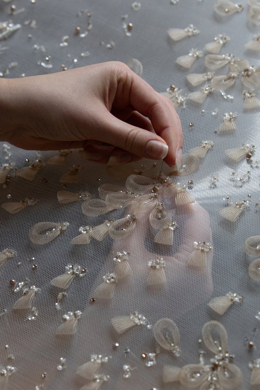 2025年春夏オートクチュール コレクションでマリア・グラツィア・キウリはクリノリンに関心を寄せました。クリノリンは、創設者ムッシュ ディオールがいくつかのドレスに使用したもので、大きなボリュームやコルセットの構造を作るのに適しています。今回モダンで実用的なバージョンに生まれ変わったクリノリンは、それ自体が限りないファンタジーやモチーフを生み出す、記憶を醸成するための場であることを証明しています。構造を隠したこの揺れ動くケージは、まるで枝に刺繍したかのように動きに合わせて波打ちます。アトリエ ルビュイッソンでは、伝統的なオートクチュールの技術を用いて刺繍や装飾を行い、クリノンリンに小さなフラワーのデザインを施しました。それぞれのつぼみは繊細なサテンで装飾され、反射特性を持つ真珠のようなボールが輝きます。