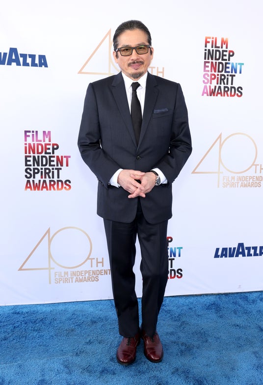 真田広之は、メンズ コレクションからネイビーウールのピークラペルスーツに、クラシックなホワイトのコットンシャツを纏い、ブラックのシルクタイを合わせました。