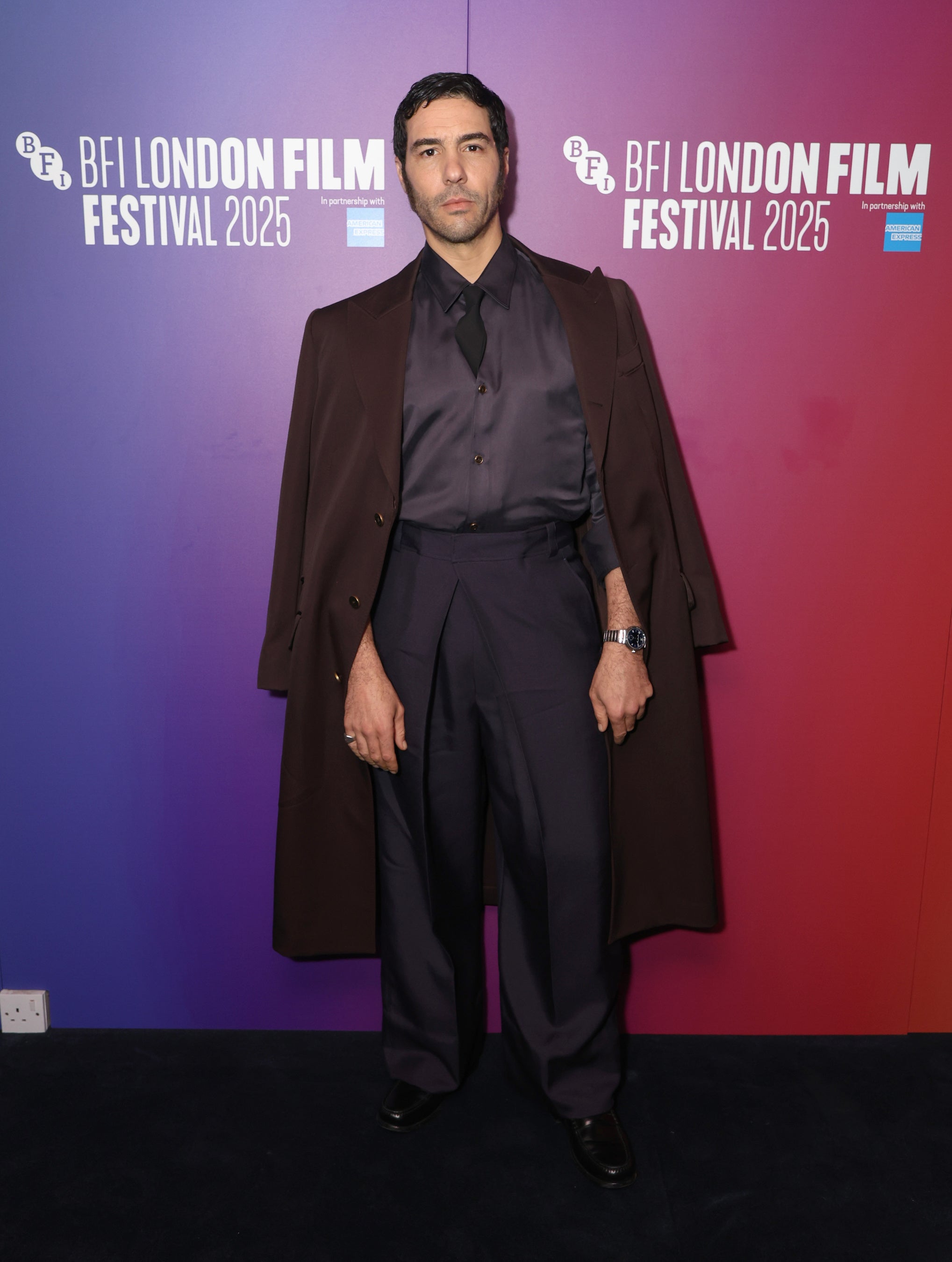 タハール・ラヒムは、映画「Alpha(原題)」の上映会に、ブラウンのシングルブレストコートにパープルのシルクシャツ、プリーツ入りのパープルパンツ、ブラックのネクタイとローファーをコーディネートしました。