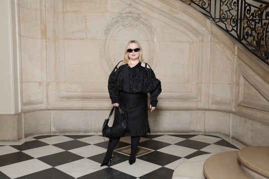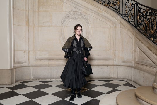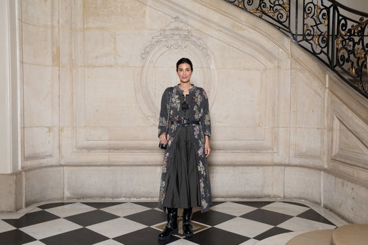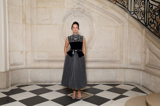 ラフィー・キャシディは、2025年クルーズ コレクションから刺繍が施されたブラックのシルクジャケットをブラックのシルクトップとショーツの上に纏い、ブラックのプリーツシルクスカートを合わせました。また、ディオールのアクセサリーも着用しました。