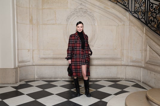 マロリー・ワネックは、2024-2025年秋冬コレクションからレッドのタータンチェックウールコートとスカートに、ブラックのカシミアタートルネックを合わせました。