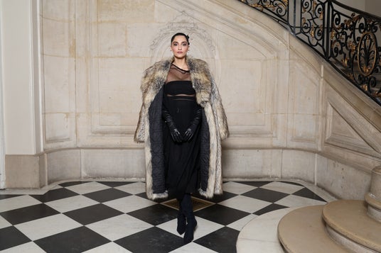 ソナム・カプールは、2025年春夏コレクションからブラックのニットドレスに、2025年クルーズ コレクションからフェイクファーを纏い、ブラックのレザーグローブを合わせました。
