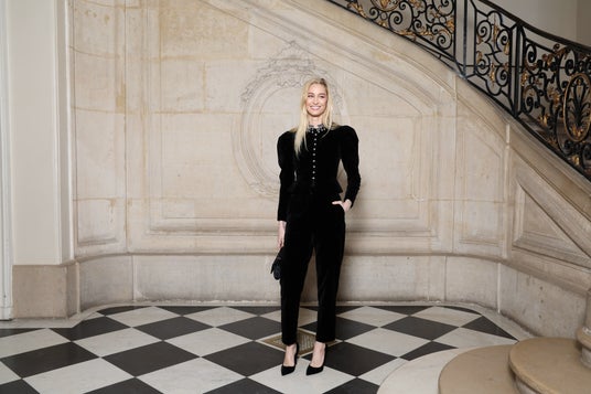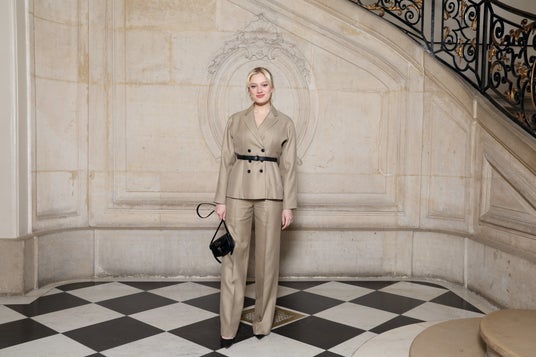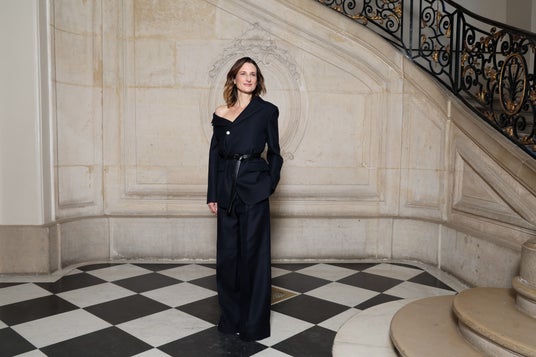 カーリー・クロスは、ブラックのウールとシルクのスーツを纏い、ディオールのアクセサリーを合わせました。