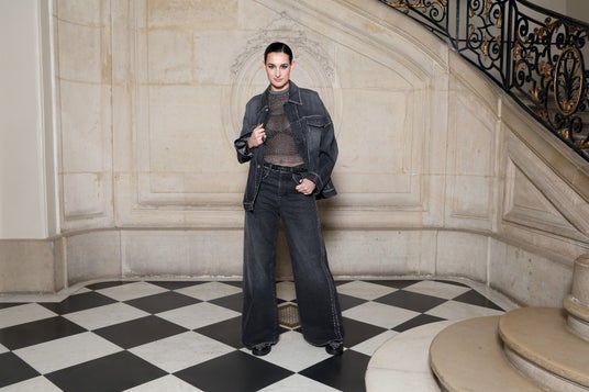 ナイン・ドゥルソは、2025年クルーズ コレクションからブルーのコットンジャケットとパンツに、刺繍が施されたチュールトップスを纏い、ディオールのアクセサリーを合わせました。