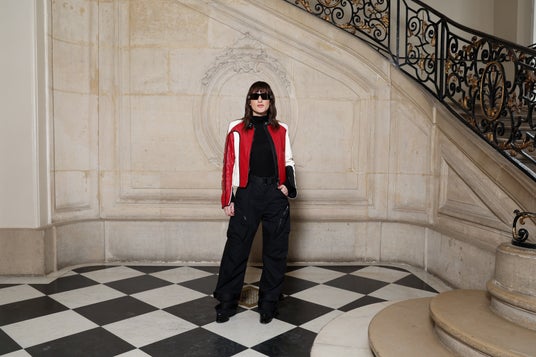 ナオミ・スコットは、2025年春夏コレクションからブラックとホワイトのレザージャケットをブラックのコットントップとブラックのシルクパンツの上から纏い、ディオールのアクセサリーを合わせました。