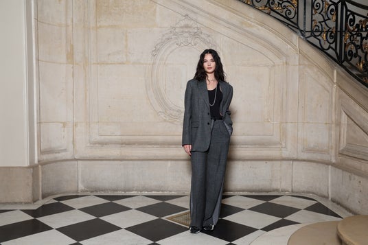 ディーヴァー・カッセルは、2025年春夏コレクションからグレーのウールとシルクのジャケットとパンツにブラックコットンボディスーツを纏いました。