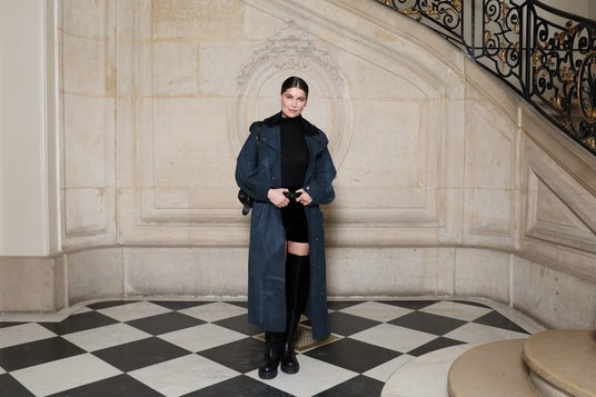 レティシア・カスタは、2025年クルーズ コレクションからブラックのカシミアタートルネック、ブラックのウールショーツにブルーのコットントレンチコートを纏いました。