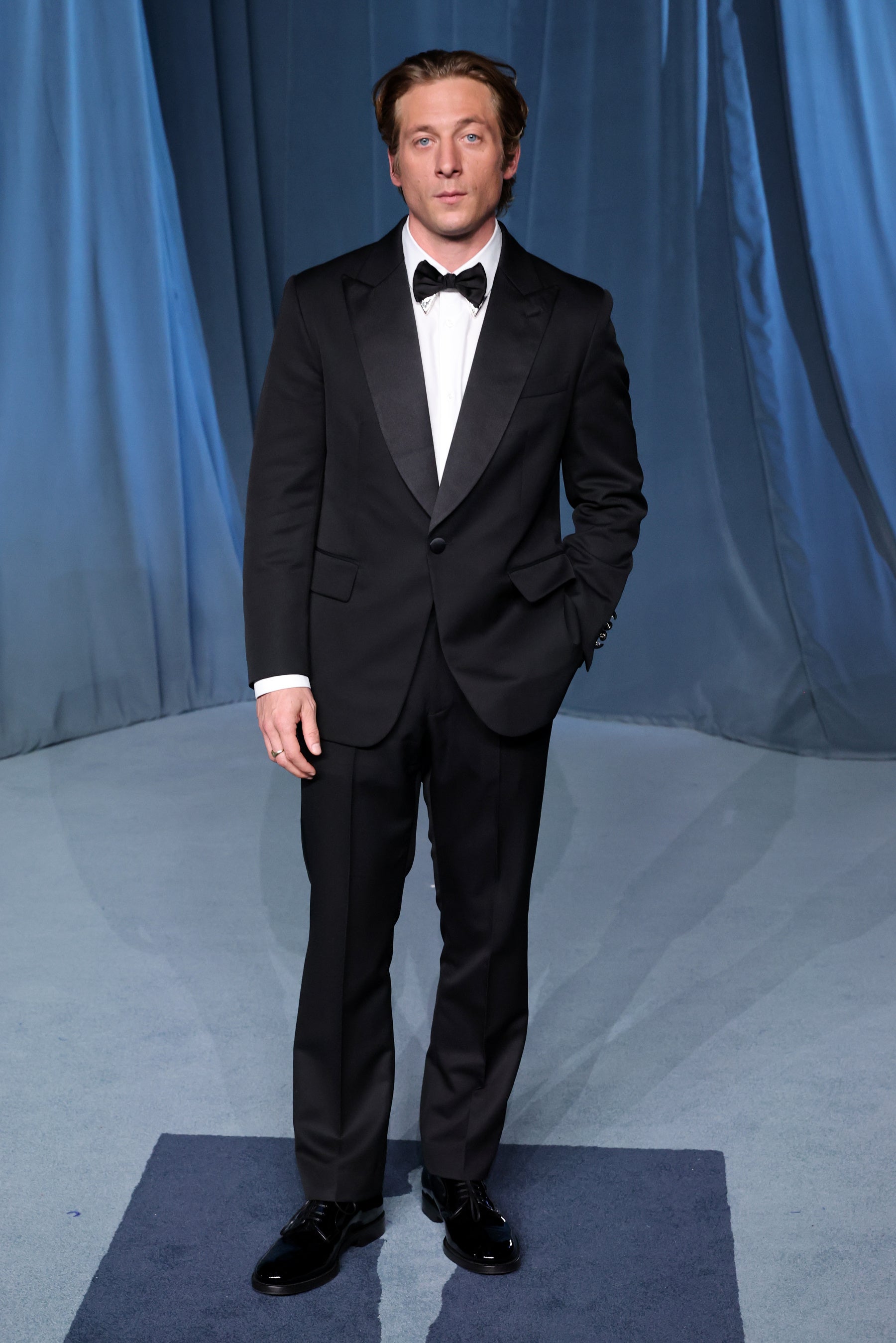 ジェレミー・アレン・ホワイトは、ピークドラペルのシングルブレスト タキシードに、襟先にシルバーの飾りが付いたホワイトシャツと、ブラックのダービーシューズをコーディネートしました。