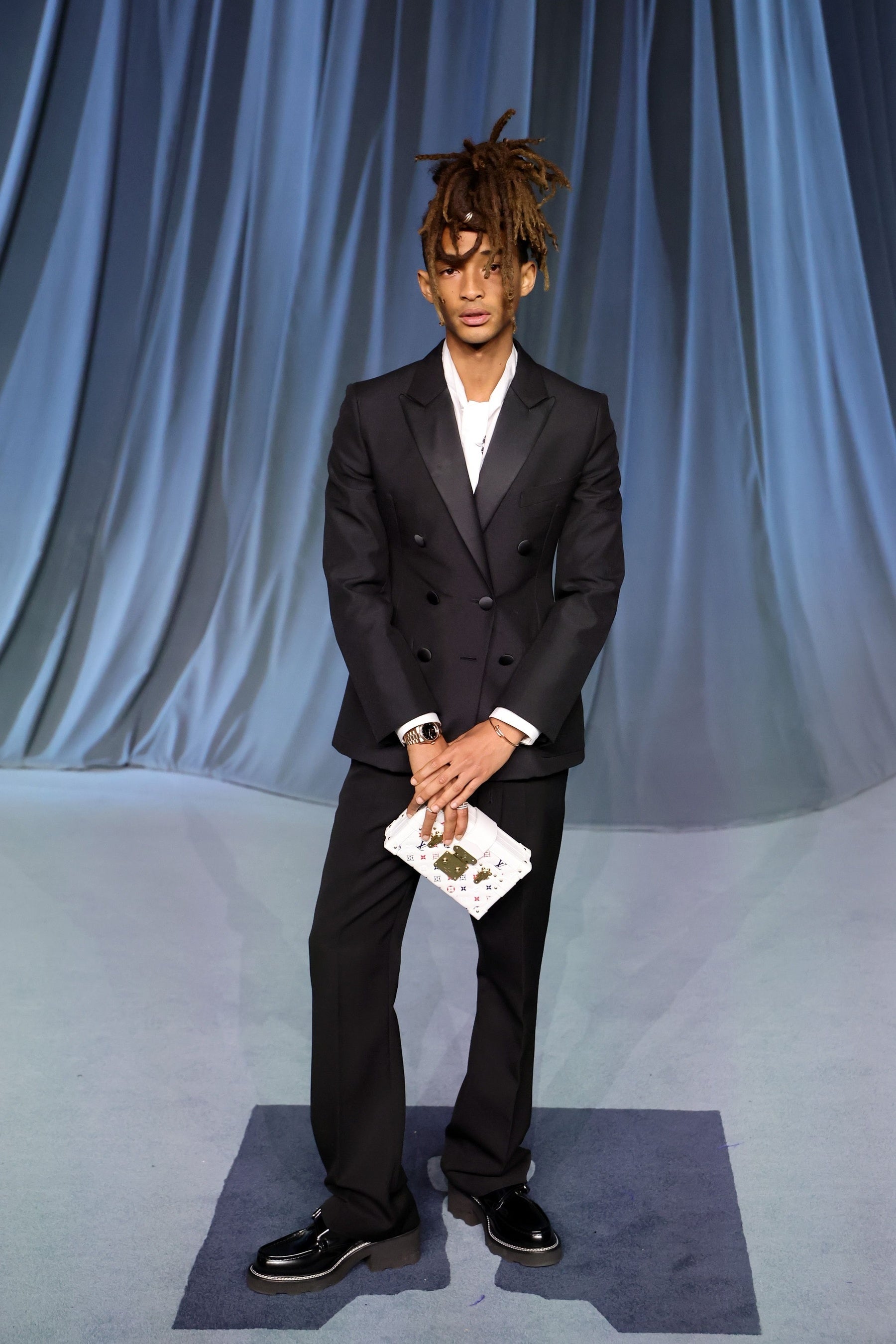 ジェイデン・スミスは、ブラックのダブルブレスト タキシードに「LV ナイト ラバリエールブラウス」、ブラックのシューズ「LV ボブール ローファー」と、ホワイトのバッグ「プティット・マル」を合わせました。