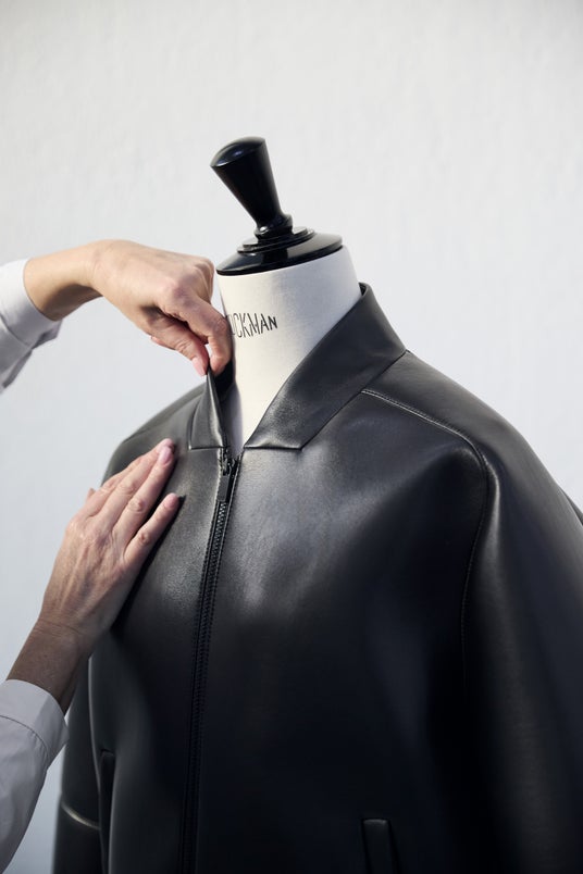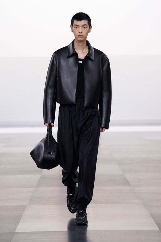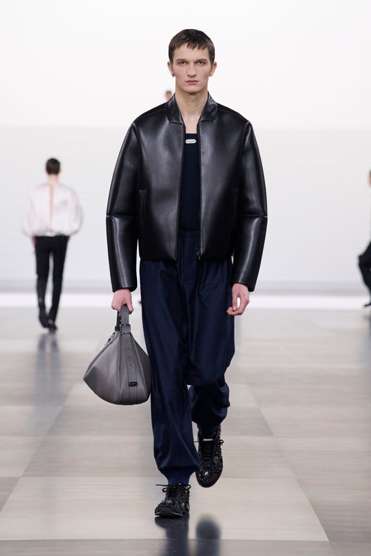 2025‐2026年ウィンター メンズ コレクションのために、キム・ジョーンズは創設者クリスチャン・ディオールのアーカイブ、特に1954-1955年秋冬 オートクチュール コレクションの「Hライン」のインスピレーションを起点にメンズウェアの進化という概念を探求しました。ルックでも登場した、構造とボリュームの両方が特徴的なレザージャケットのデザインは、クラシックなガーメントのようにパネルごとに組み立てられ、慎重に仕上げられます。襟、メッシュポケット、手首、ベルト部分のネオプレンの厚さを調整することで、重量を増やすことなく体と生地の間に生まれた空間がボリュームを生み出しました。