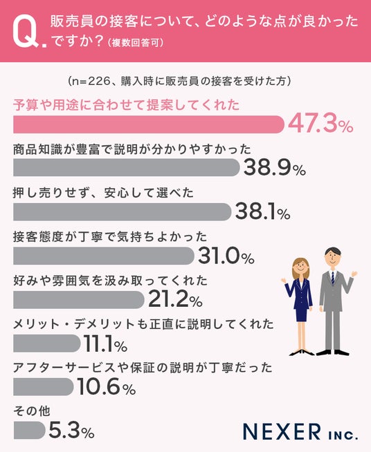 もっとも多かったのは「予算や用途に合わせて提案してくれた」で47.3%でした。次いで「商品知識が豊富で説明が分かりやすかった」が38.9%、「押し売りせず、安心して選べた」が38.1%、「接客態度が丁寧で気持ちよかった」が31.0%と続きます。