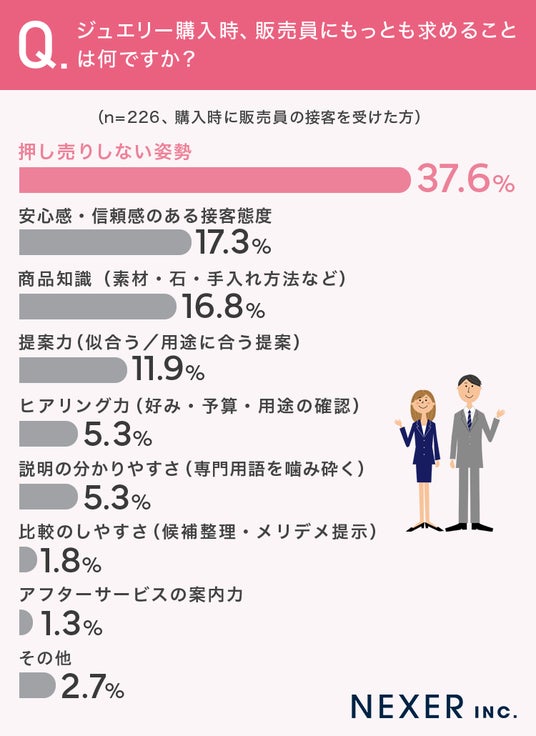 今回の調査では、ジュエリー購入経験者の約7割が店頭で接客を受けており、そのうち4割以上が接客を購入の決め手と感じていました。一方で、販売員にもっとも求めることとして「押し売りしない姿勢」が支持を集めています。
