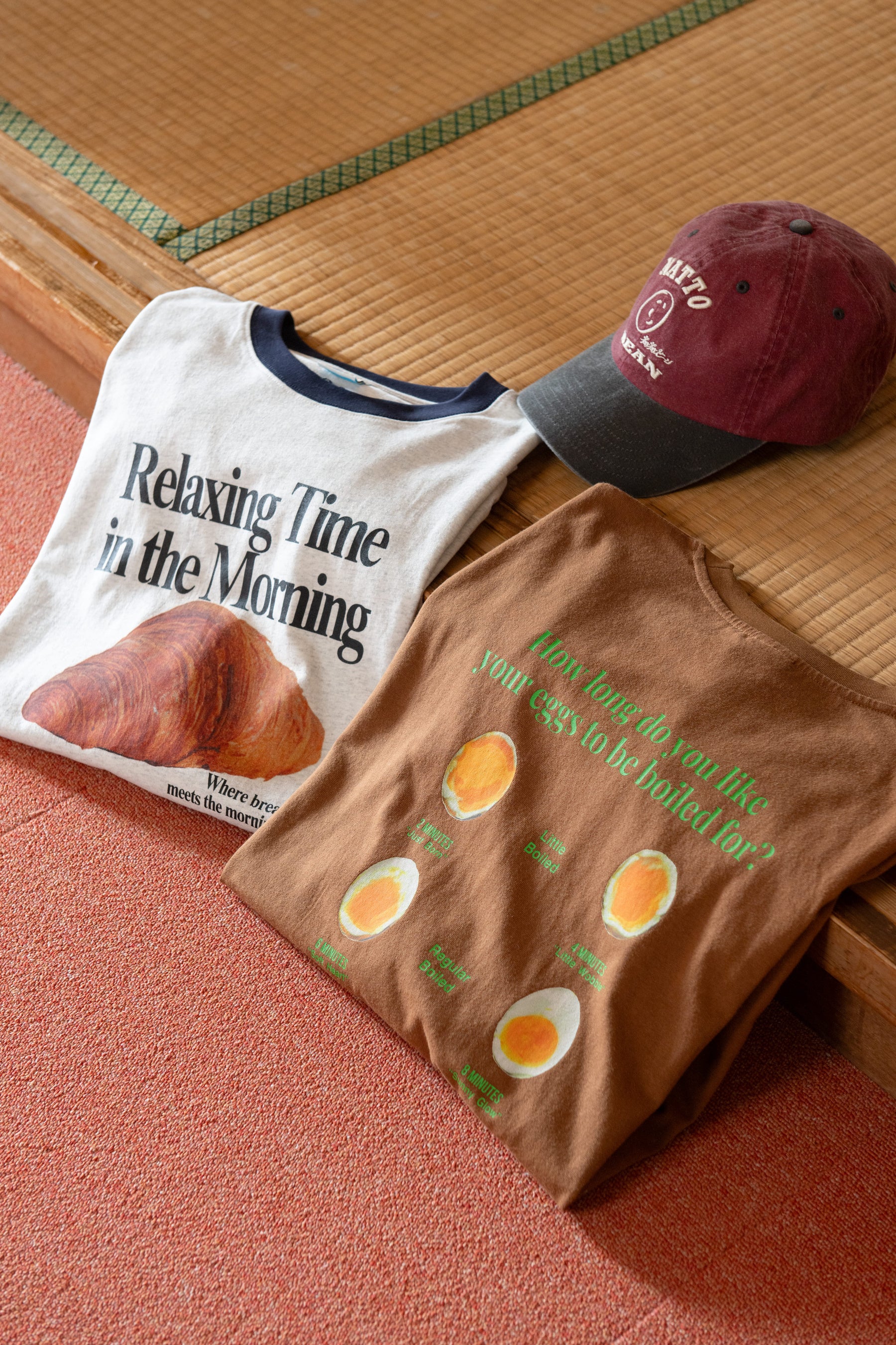 「あなたは卵の茹で加減、何分派?」というユニークなテーマをデザインに落とし込んだ、遊び心あるロングスリーブTシャツ。毎朝の食卓で誰もが一度は考える“茹で時間”へのこだわりをファッションとして表現した、卵好きにはたまらない一着です。
