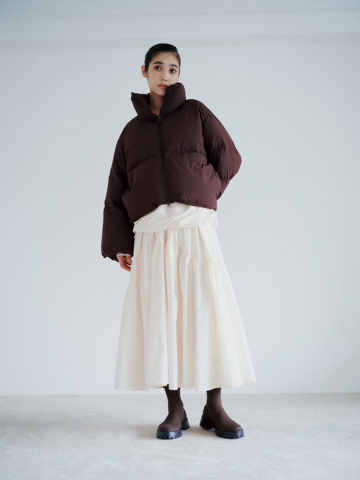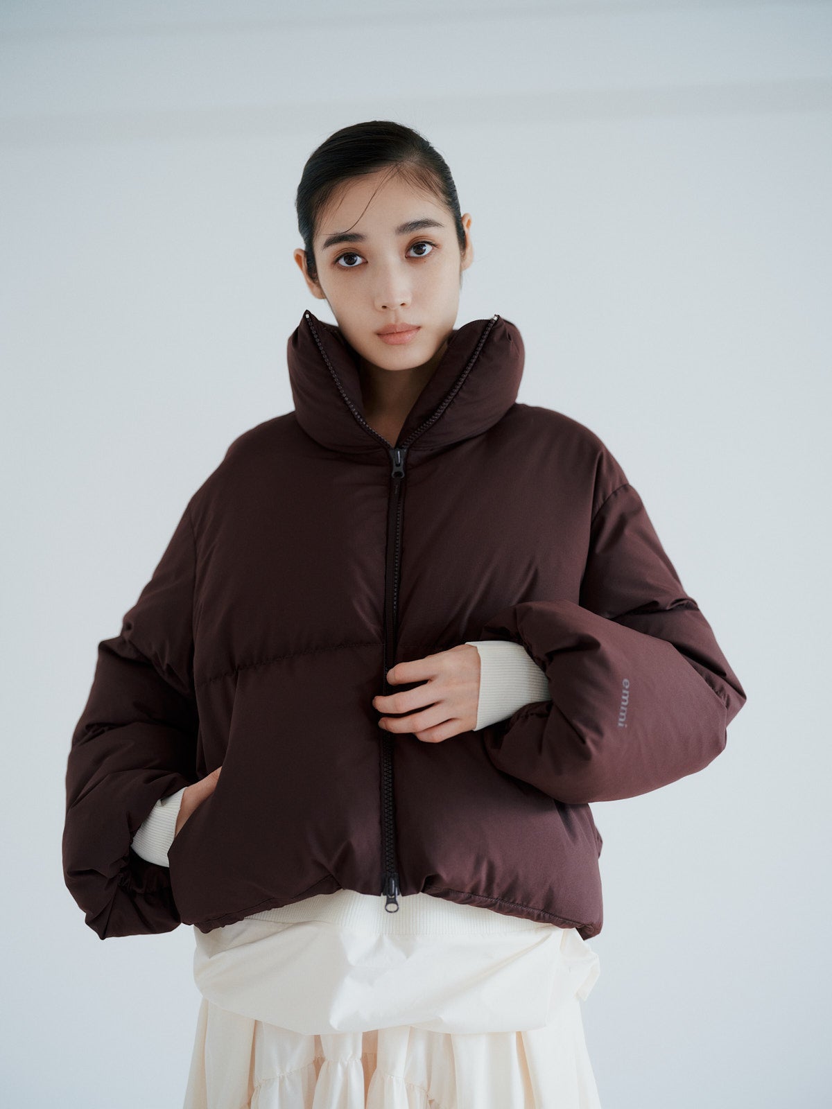 表地に水を滑らせて雨をよける撥水ファブリック『MINO TECH(ミノテック)』を使用。内側には地球に優しいリサイクルダウンを贅沢に使用し、高さのある首元とボリュームたっぷりのフォルムに仕上げました。袖口のemmiロゴがポイントです。トレンドの深みのあるブラウンはオンライン/オープン店舗限定カラーです。