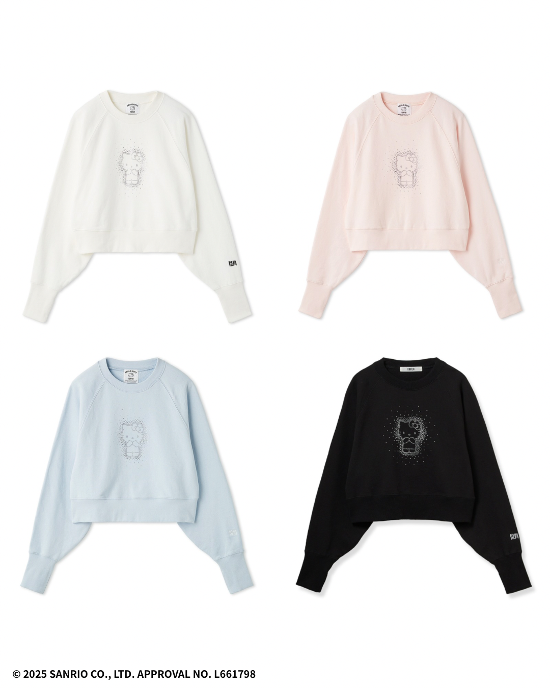 愛らしいポージングのハローキティをラインストーンで表現した華やかなスウェットプルオーバー。