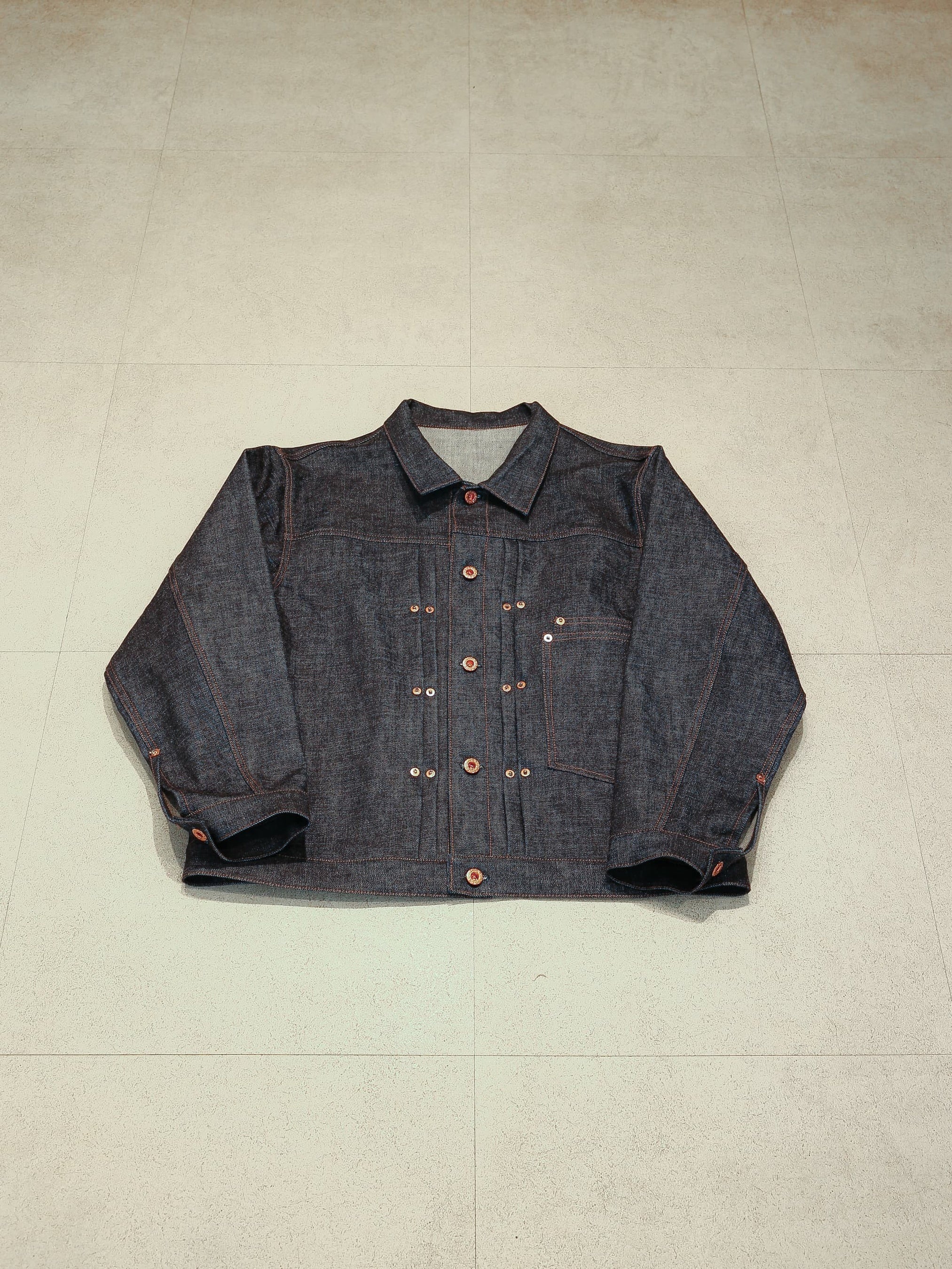 プリーツの折り目をリベットで固定したデザインのデニムジャケットです。