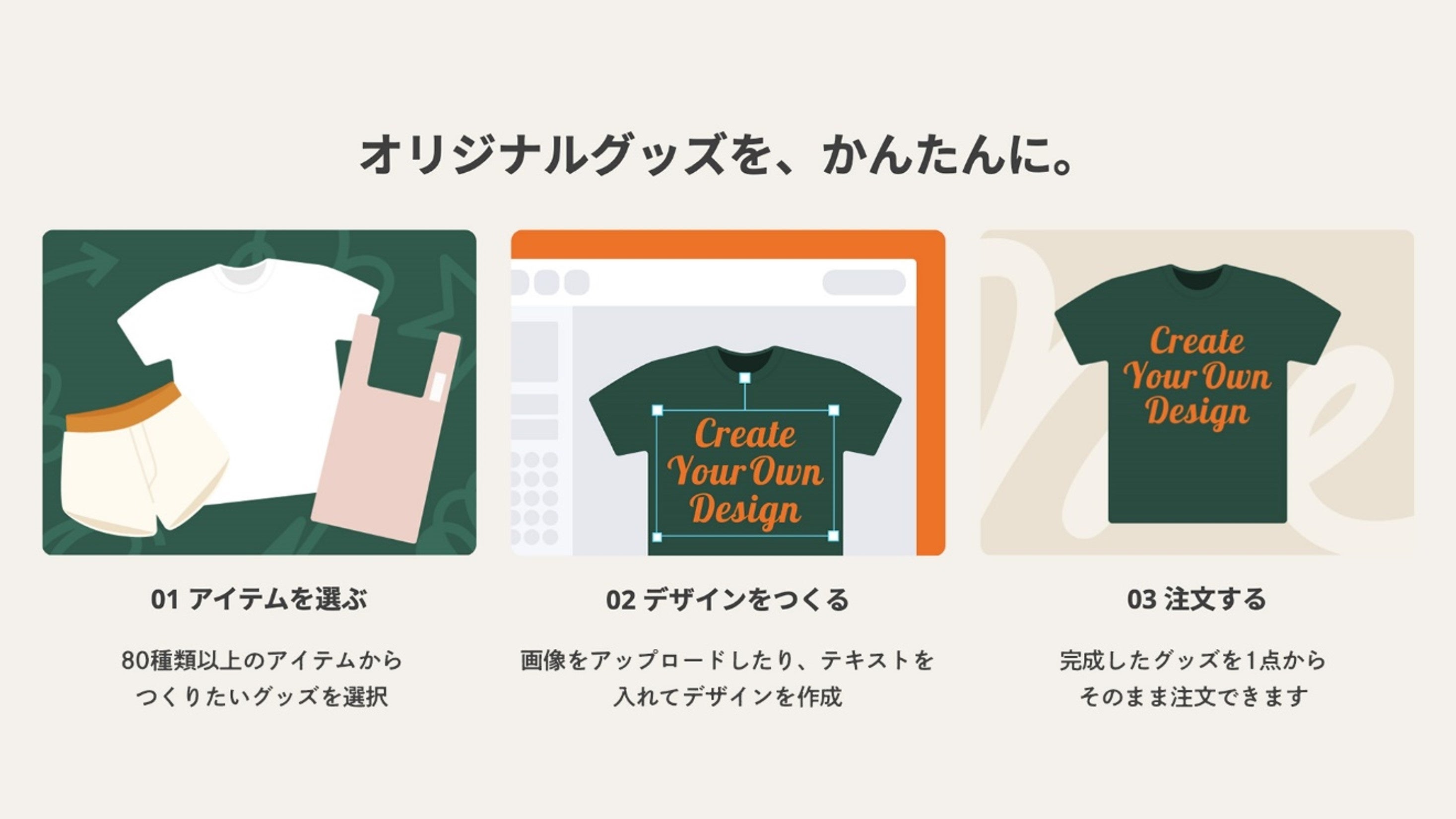 「自分買い」のボタンをクリックし、3ステップで簡単にグッズの作成から注文までを完結することができます。